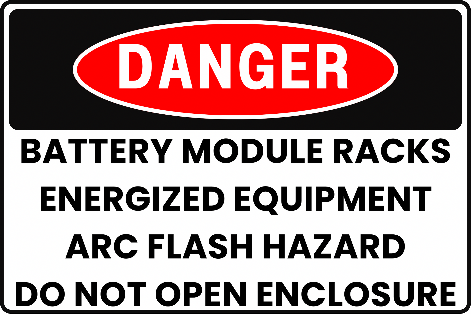 This DANGER sign effectively communicates the severe arc flash hazard present near battery module racks and energized equipment. It mandates caution and prohibits unauthorized access to enclosures, preventing serious injuries.