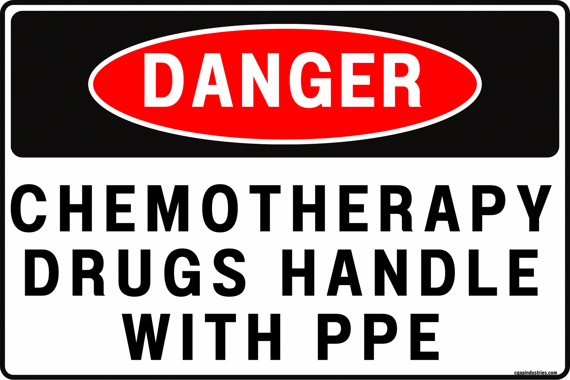 The CGAP Safety DANGER – Chemotherapy Drugs – Handle With PPE sign is designed to set expectations immediately at the point of access. The message is intentionally blunt and readable at a distance, supporting controlled handling policies in oncology clinics, infusion centers, hospital pharmacies, compounding areas, and hazardous drug storage locations. It functions as a visual “stop and comply” cue for staff, contractors, float personnel, and anyone passing through shared clinical spaces.