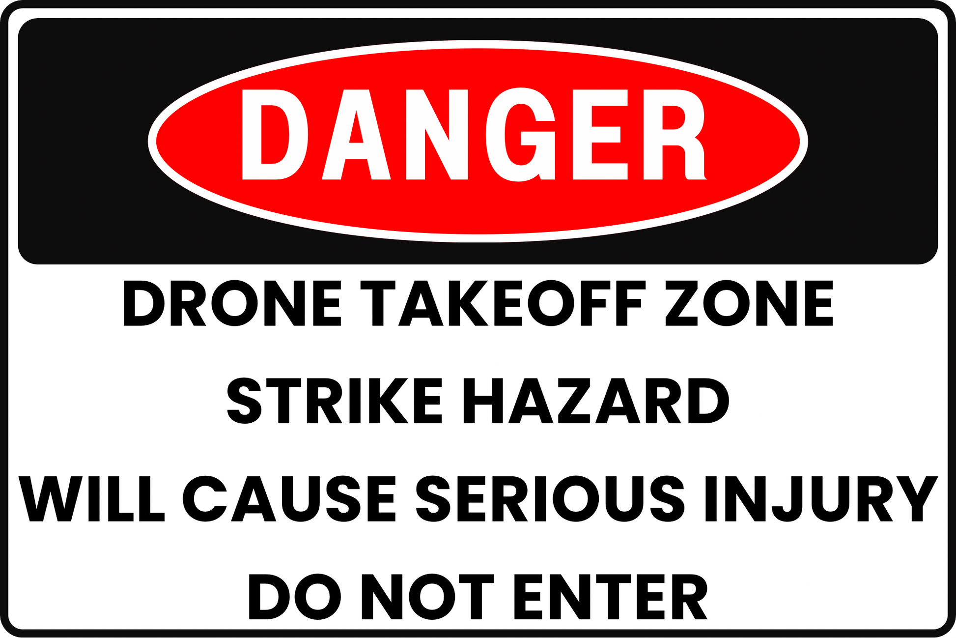 This DANGER sign is designed to restrict access near drone takeoff zones where aircraft movement creates a strike hazard with serious injury potential. The high-contrast layout helps ensure the warning is seen quickly, supporting safer operations around launch and landing areas.