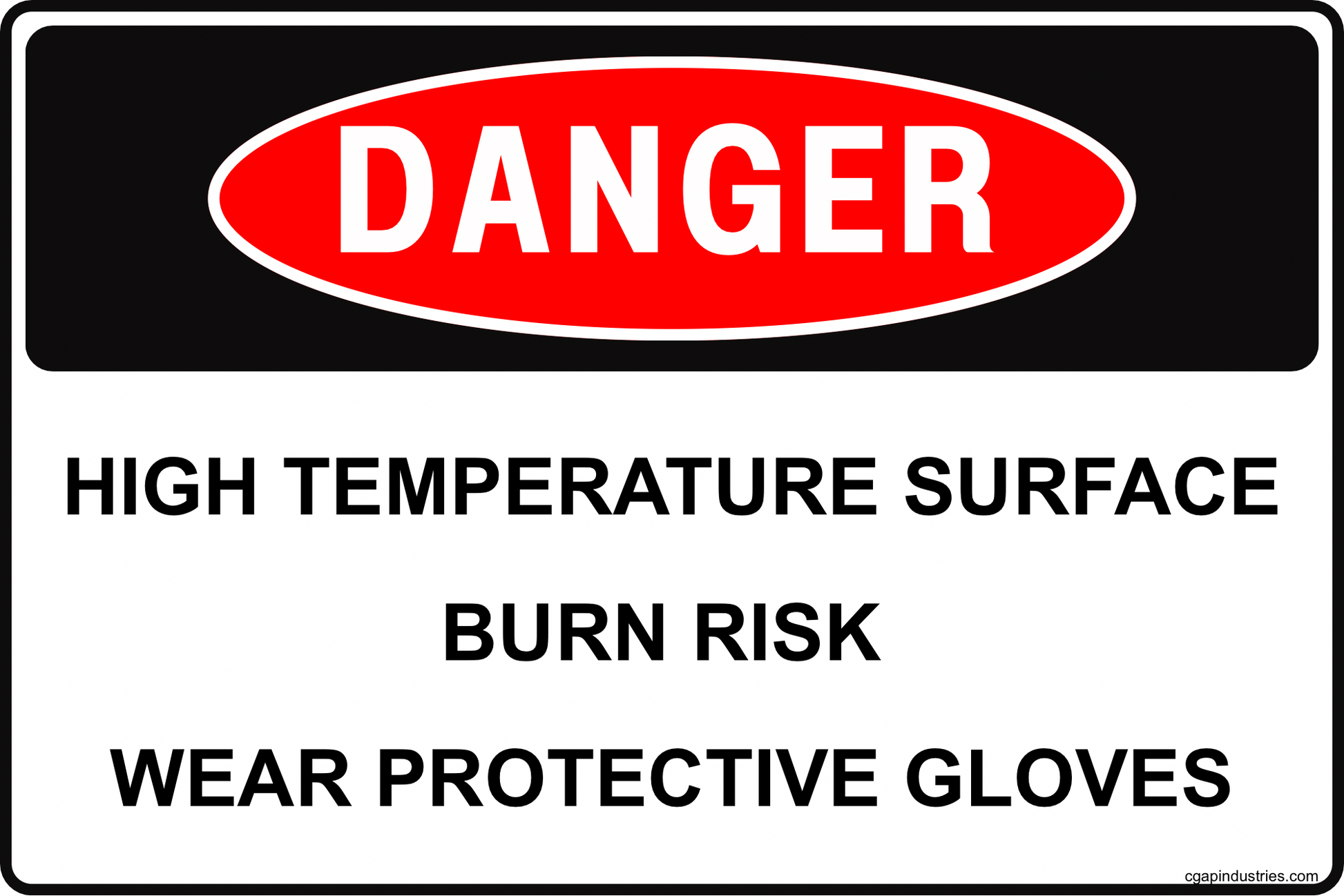 The CGAP Safety “Danger – High Temperature Surface – Burn Risk – Wear Protective Gloves” sign is designed to mark hot equipment, piping, and surfaces where contact can cause burns. The bold red DANGER header and straightforward wording remind workers to treat the area as a burn hazard and to wear protective gloves before touching the surface.