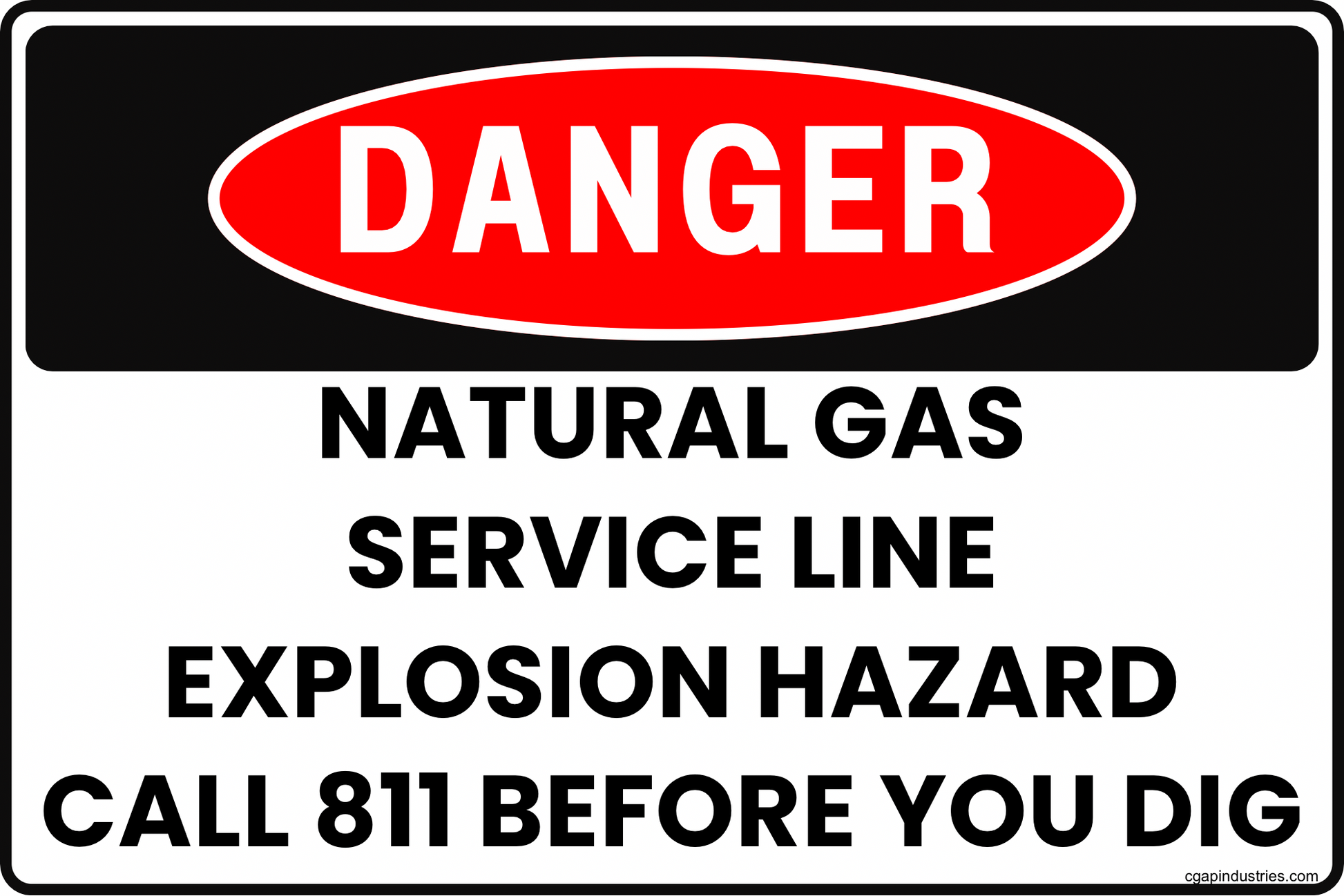The CGAP Safety “Danger – Natural Gas Service Line – Explosion Hazard – Call 811 Before You Dig” sign is a high-visibility warning marker for areas where buried gas service lines may be present and excavation activity is likely. The bold DANGER header and straight-to-the-point wording create an immediate stop-and-think moment for contractors, landscapers, homeowners, and maintenance teams before they put a shovel, auger, trenching tool, or post driver into the ground.