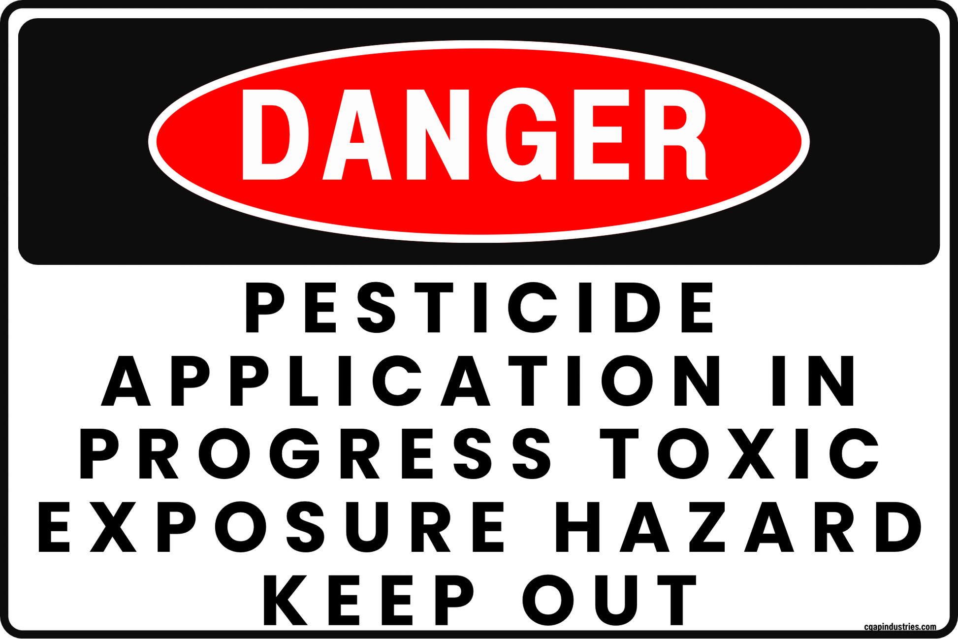 - High-Visibility Restricted Access Warning: Bold DANGER header and large text communicate active pesticide application and restricted entry at a glance.