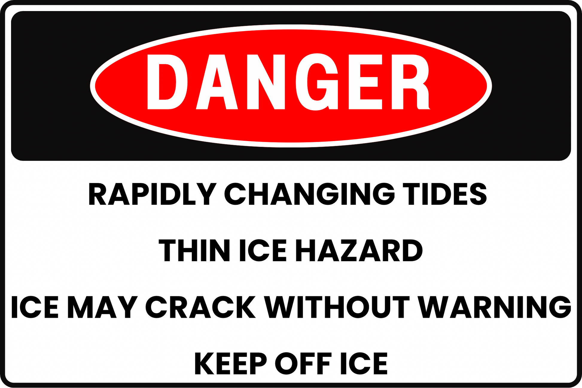 The layout follows a practical risk-communication structure: it identifies the condition (rapidly changing tides), defines the hazard (thin ice), explains the consequence (ice may crack without warning), and states the required action (keep off ice). That clarity helps reduce hesitation, confusion, and dangerous assumptions in public access areas.