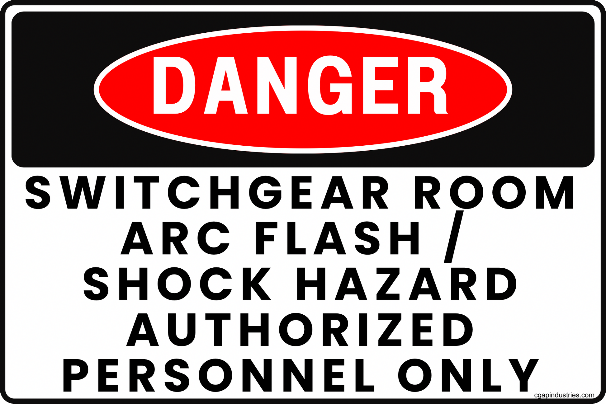 - SWITCHGEAR ROOM DANGER SIGN – “Danger / Switchgear Room / Arc Flash / Shock Hazard / Authorized Personnel Only” clearly communicates a high-energy electrical hazard area with restricted access requirements.