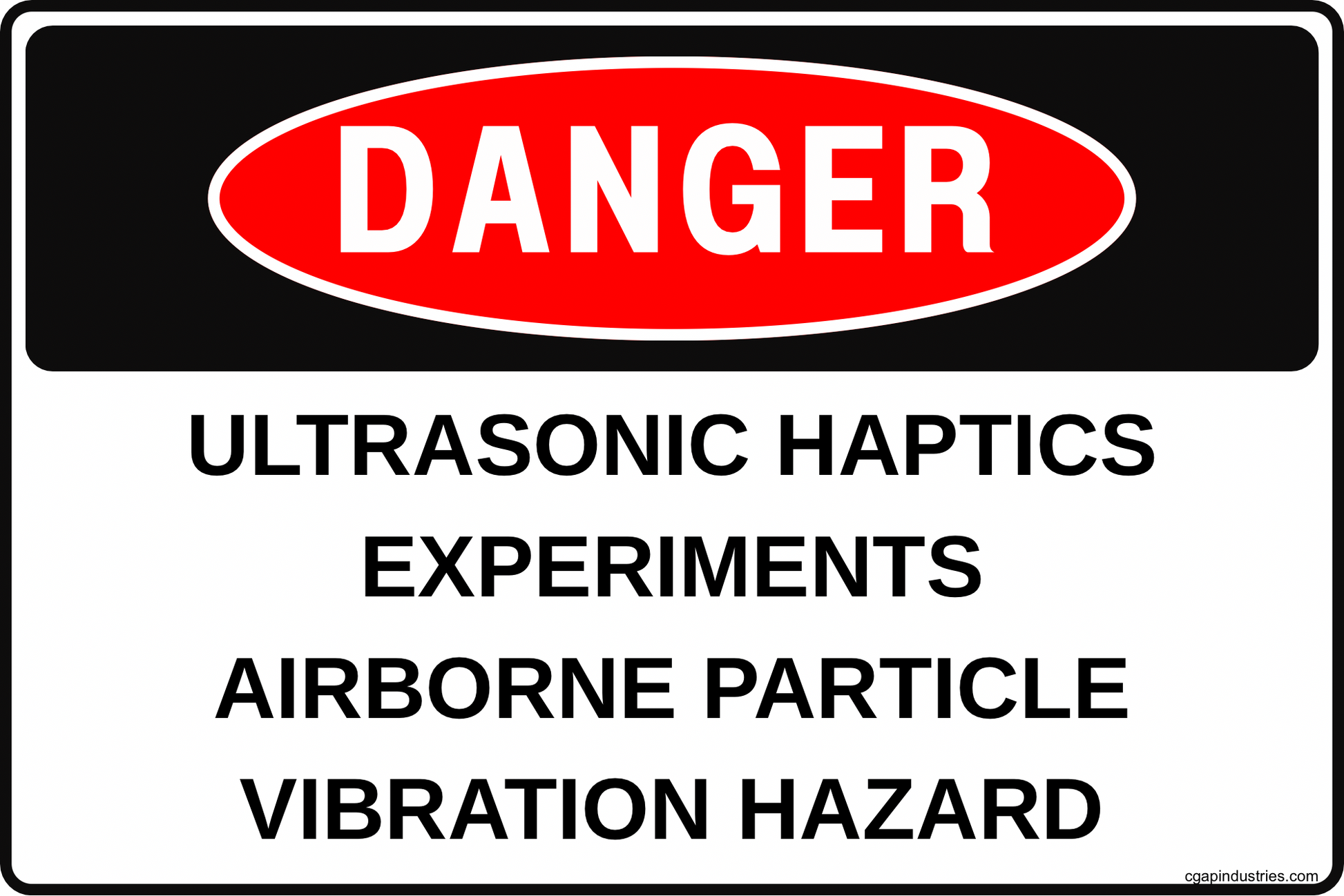 The Solution: This DANGER: ULTRASONIC HAPTICS EXPERIMENTS – AIRBORNE PARTICLE VIBRATION HAZARD sign establishes a controlled environment immediately. It signals that testing is active, hazards are non-standard, and access should be restricted to authorized personnel following site procedures.