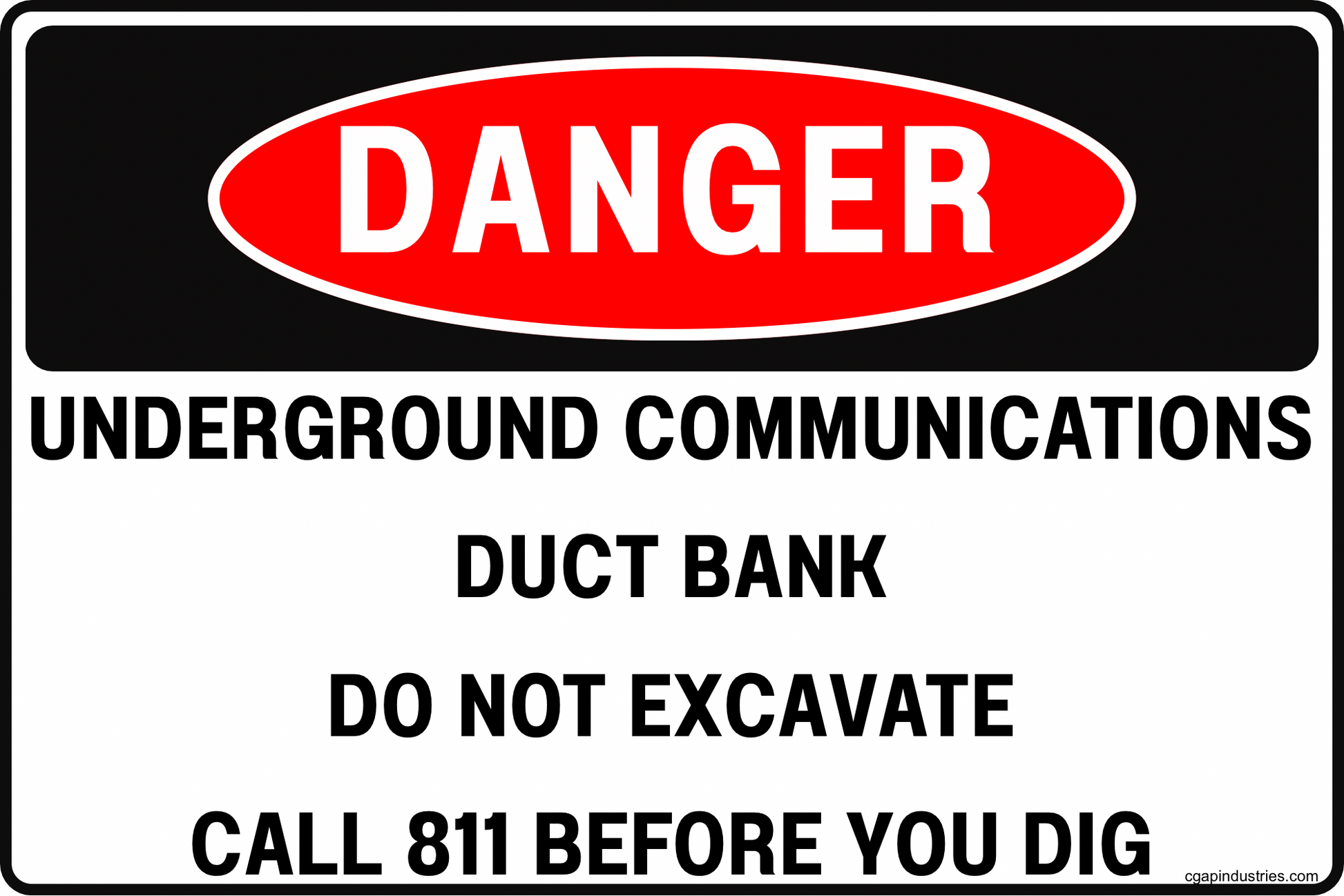The CGAP Safety “Danger – Underground Communications – Duct Bank – Do Not Excavate – Call 811 Before You Dig” sign is a high-visibility warning marker for buried communications duct banks and conduit corridors. The bold DANGER header and direct “DO NOT EXCAVATE” language are designed to interrupt excavation activity immediately, while the Call 811 instruction reinforces the correct next step for compliant locating and safe digging.