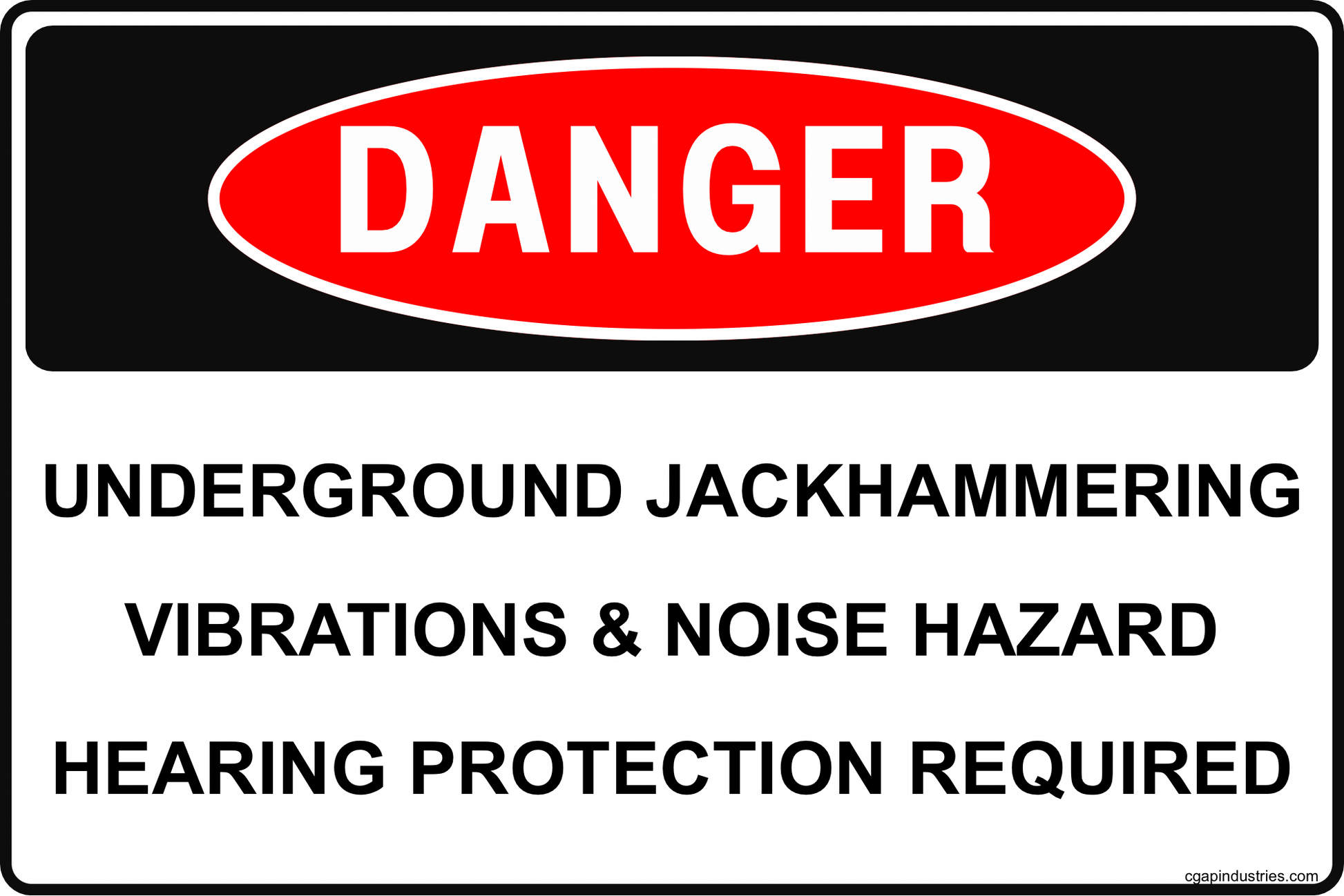 The CGAP Safety “Danger – Underground Jackhammering – Vibrations & Noise Hazard – Hearing Protection Required” sign is designed for tunneling, mining, and heavy civil projects where jackhammers and breakers are used below grade. The bold red DANGER header and straightforward text warn crews and visitors that they are entering an area with significant noise and vibration hazards and that hearing protection is required.