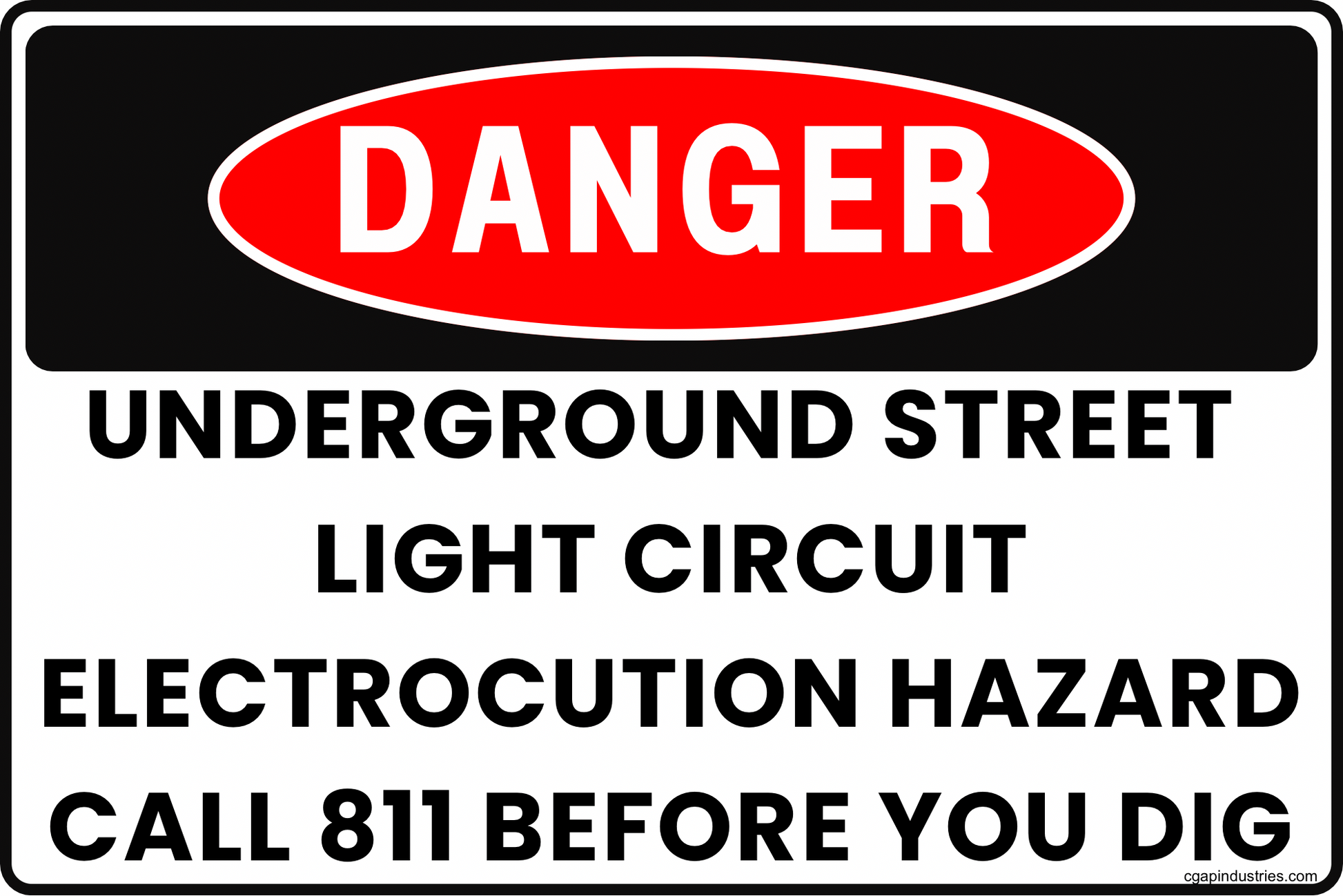 The CGAP Safety “Danger – Underground Street Light Circuit – Electrocution Hazard – Call 811 Before You Dig” sign is a high-visibility marker for areas where buried street light electrical circuits may be present. The bold DANGER header and direct wording are designed to interrupt the most common failure mode: someone assumes it’s low risk and starts digging, boring, or driving anchors without confirming what’s below grade.