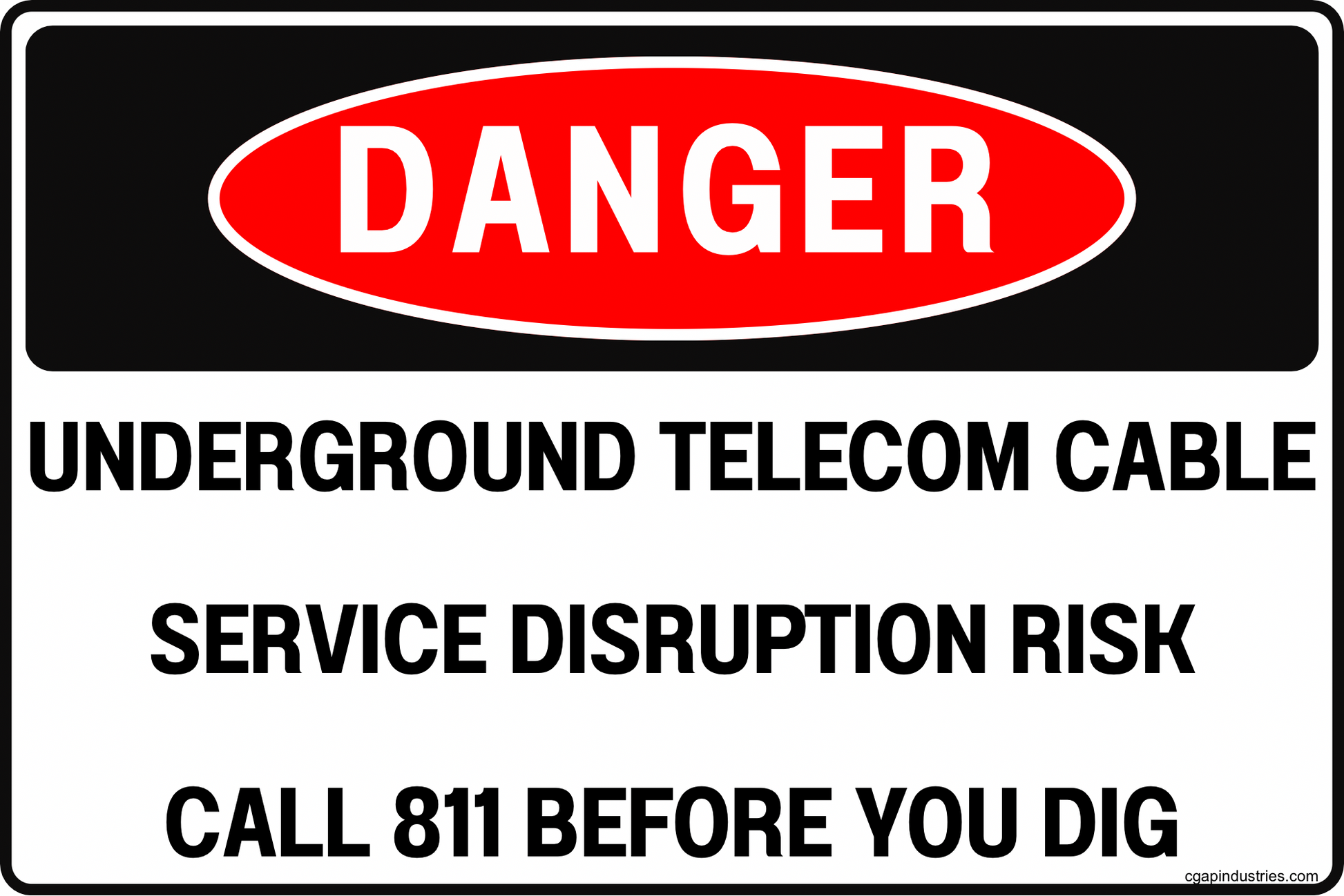 The CGAP Safety “Danger – Underground Telecom Cable – Service Disruption Risk – Call 811 Before You Dig” sign is a high-visibility warning marker for areas where buried telecommunications infrastructure is present. The bold DANGER header and simple, direct wording are designed to stop the “we’ll just dig real quick” mindset before it turns into an outage.