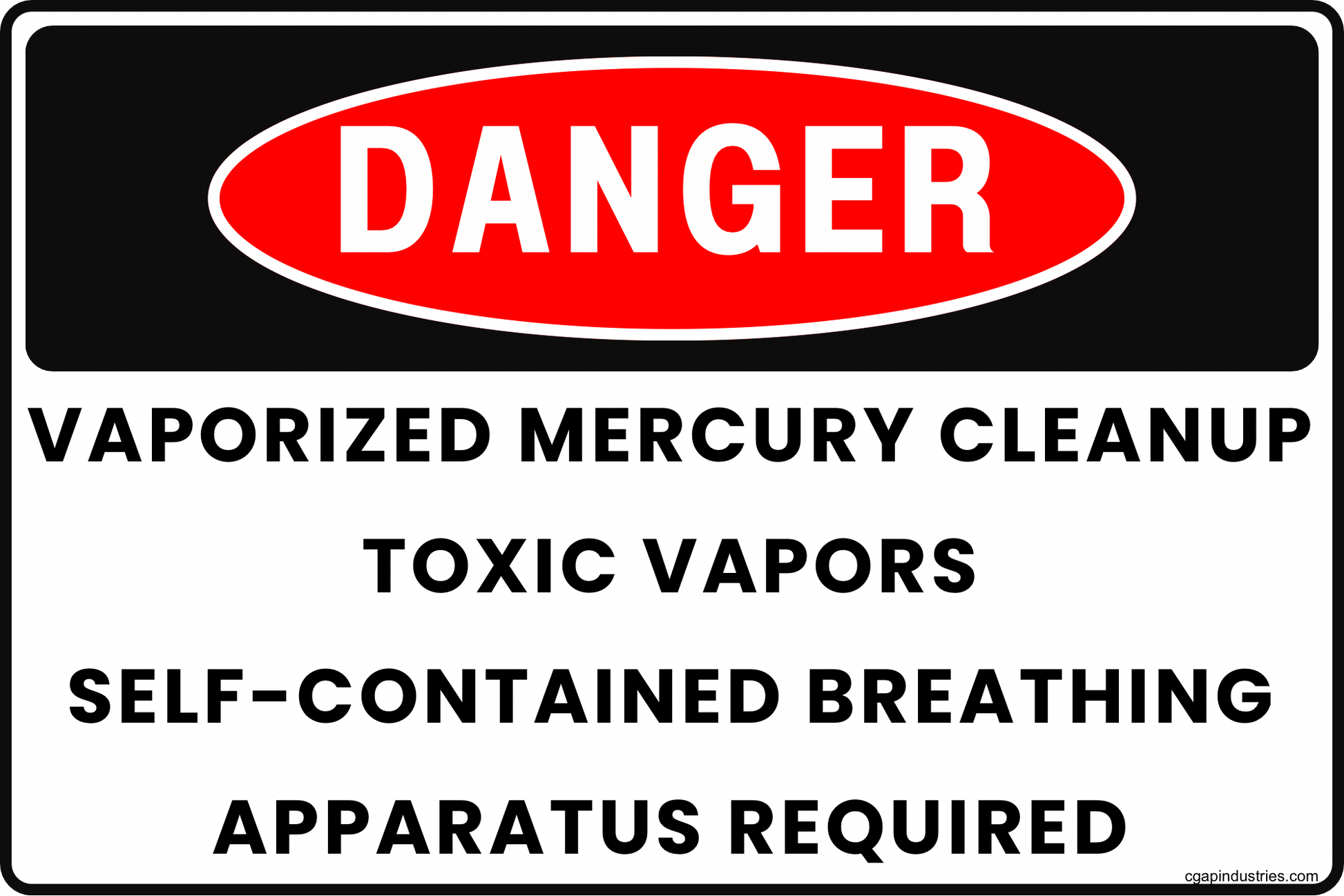 - MERCURY CLEANUP WARNING SIGN – “Danger / Vaporized Mercury Cleanup / Toxic Vapors / Self-Contained Breathing Apparatus Required” clearly communicates that mercury vapor may be present and that SCBA is required in the designated area.