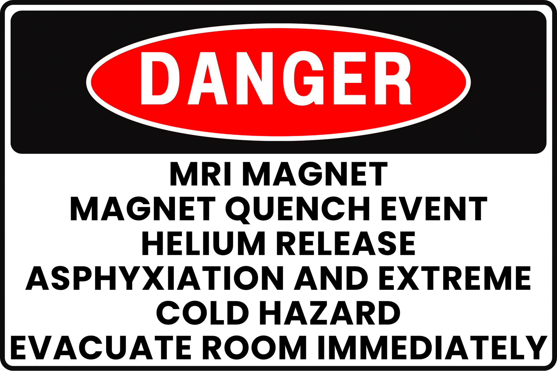 This DANGER sign warns of the critical threat posed by an MRI magnet quench, where cryogens like liquid helium are rapidly released. This event creates an immediate risk of asphyxiation and freezing due to oxygen displacement and extreme cold.